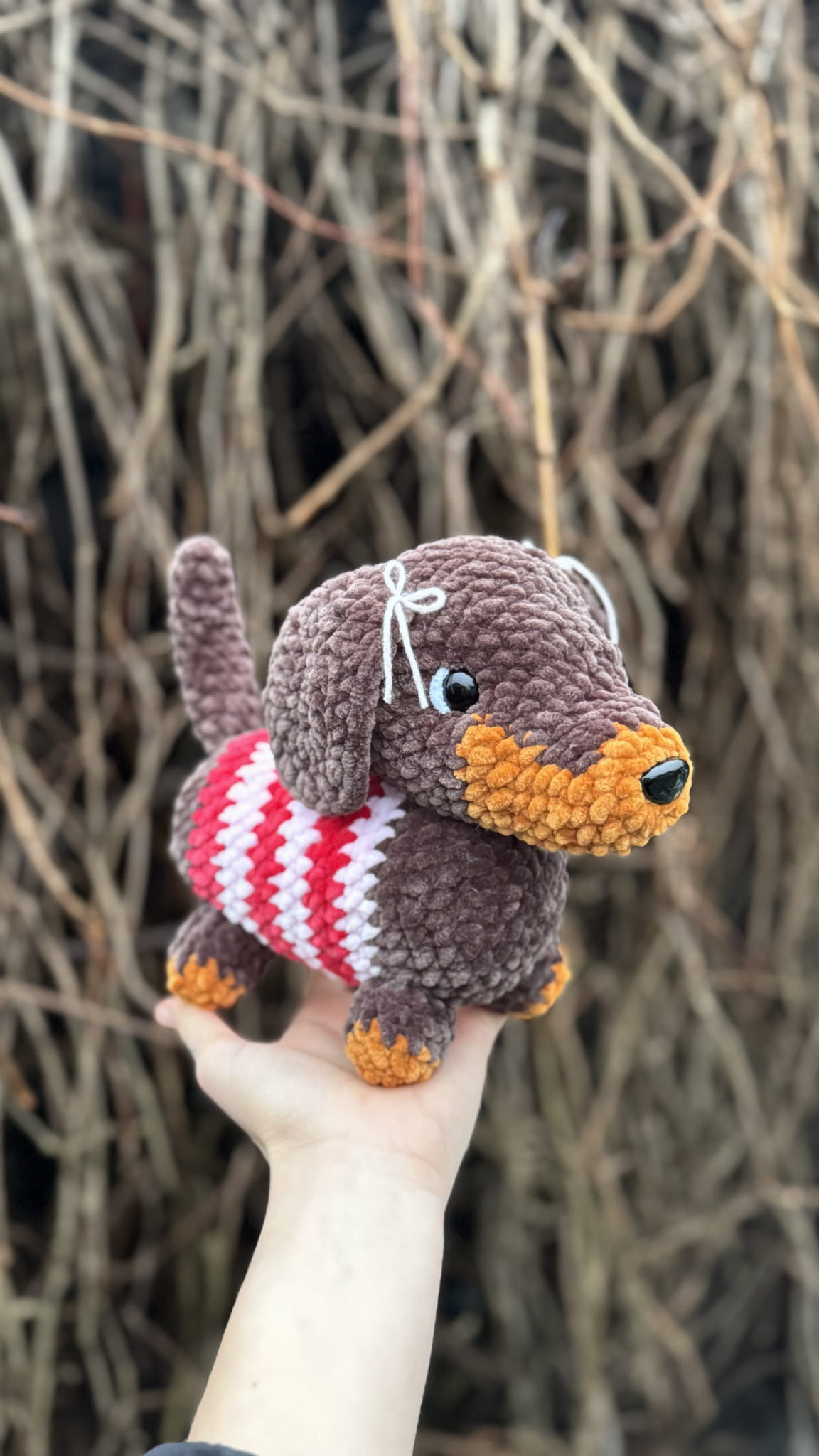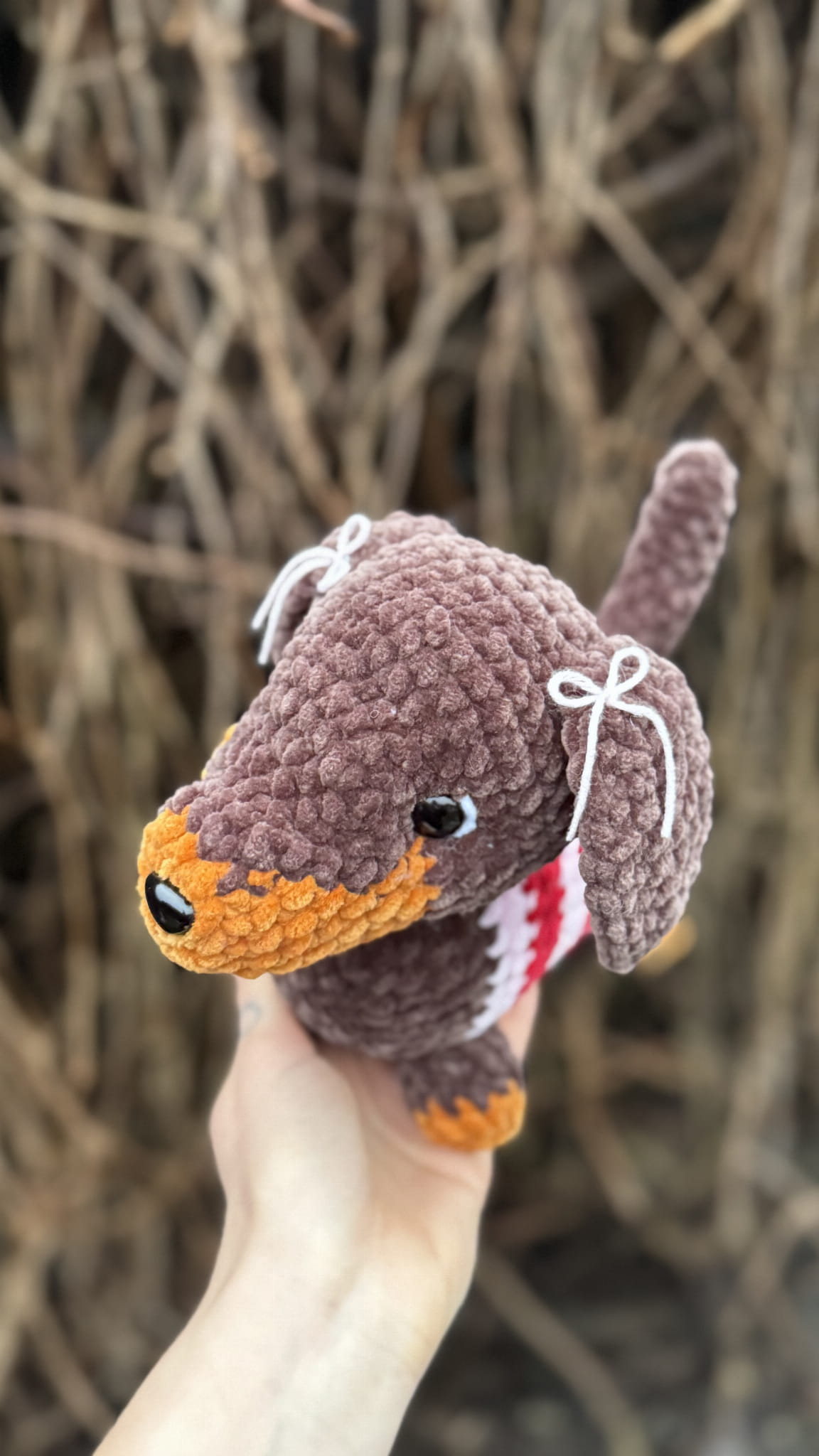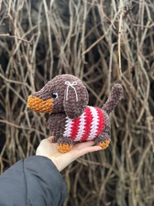 Ręcznie wykonany pluszak stworzony z miękkiej, pluszowej włóczki Luna Art Baby Fox o delikatnej, chenillowej strukturze. Materiał posiada certyfikat OEKO-TEX® Standard 100, co potwierdza jego wysoką jakość i bezpieczeństwo.